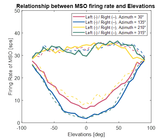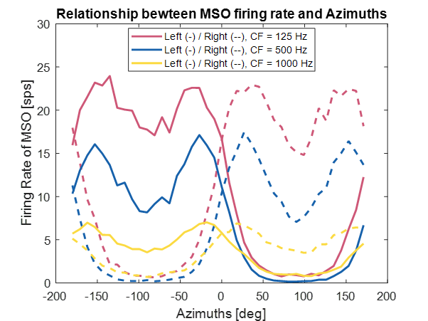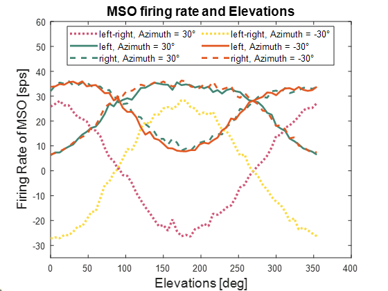 Furthermore, I am employing another model to simulate the MSO, using HRTFs convolved with a sine tone as input. This model reveals a nonlinear relationship between azimuth/elevation angles and the averaged MSO firing rates for each characteristic frequency,
