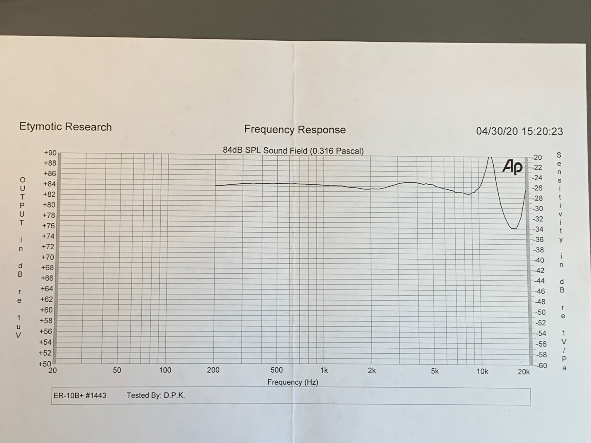 The blue curve is the output of our old ER10B+. It rolls off above 12 kHz and looks very similar to the frequency response provided by Etymotic with the microphone (see attached file ER10B_Etymotic).